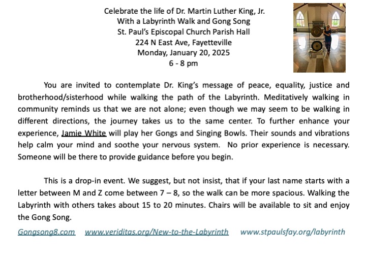 Please join us walking the Labyrinth in community while contemplating the inspiring messages of Dr. Martin Luther King. As you walk, the soothing sounds and vibrations of the Gongs and Singing Bowls will wash over you. Come any time between 6 – 8 pm for this heart warming gathering.